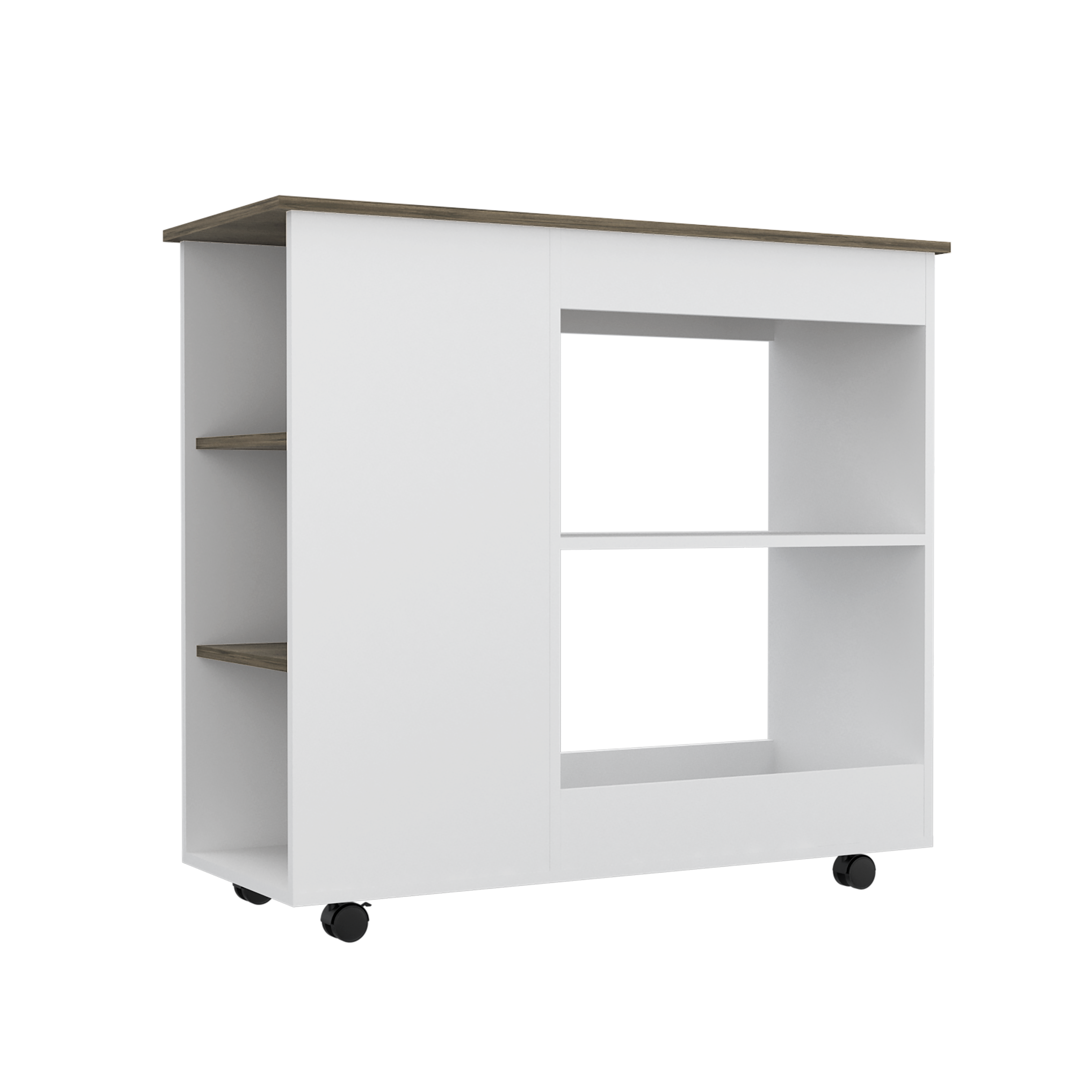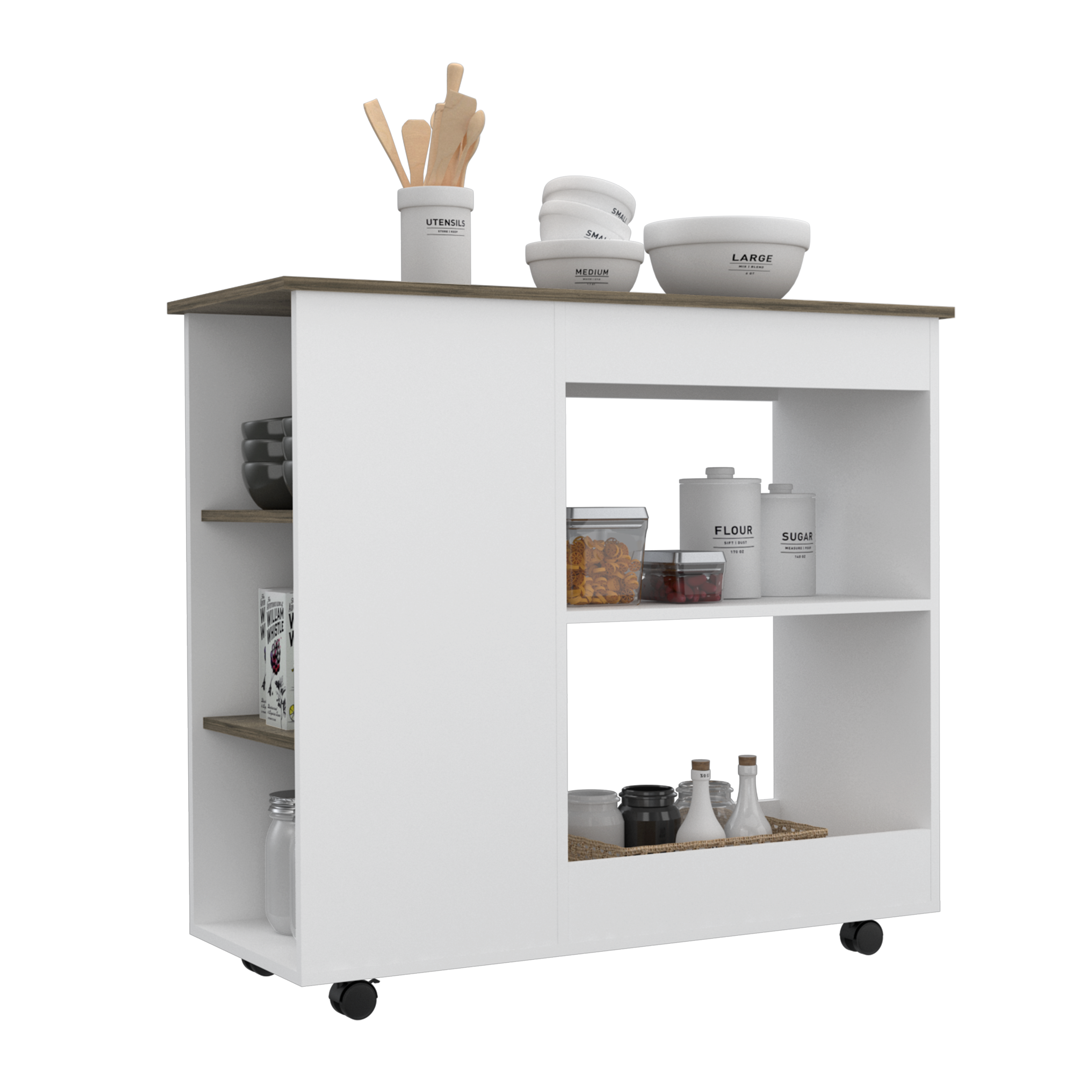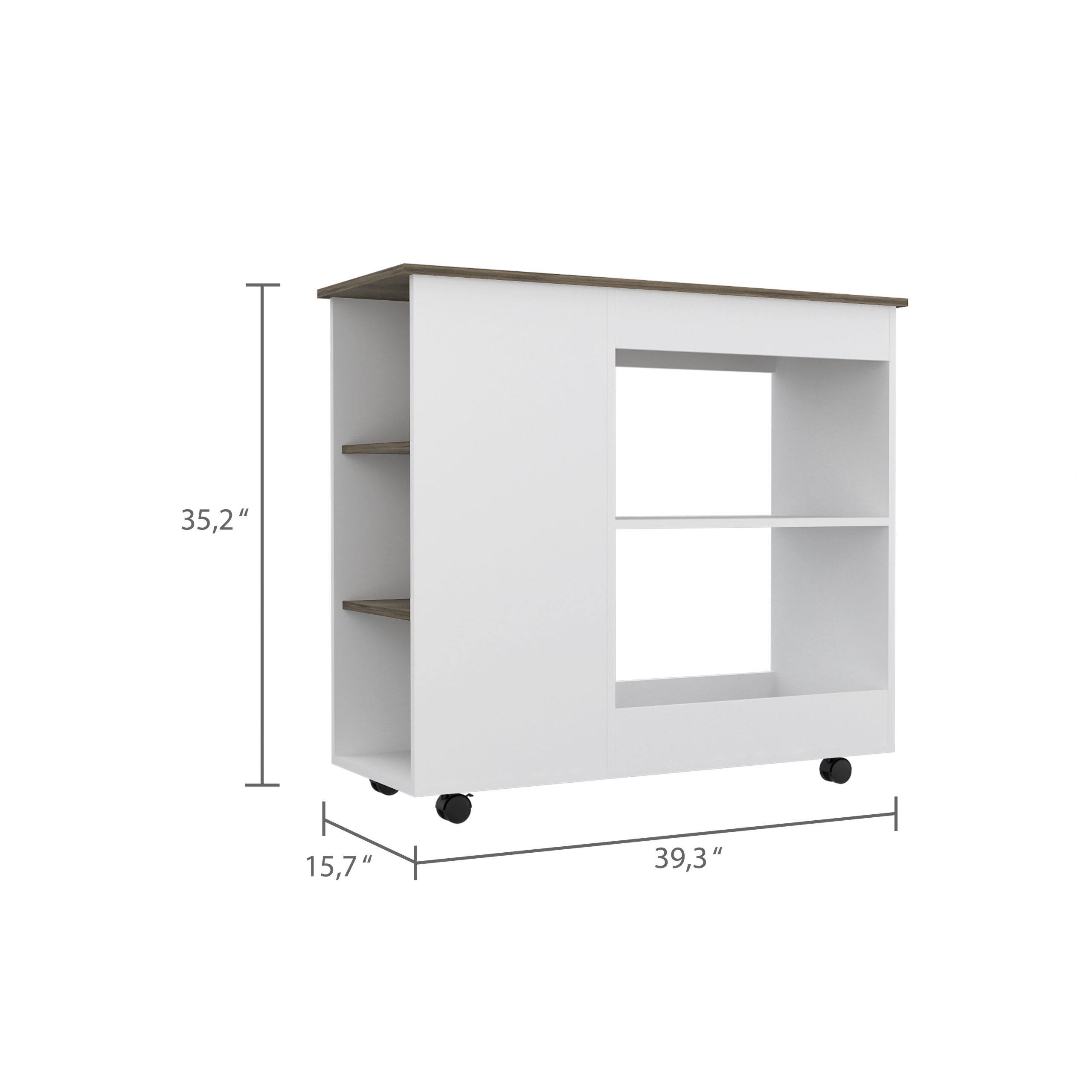 The two large shelves (11,3” H x 11,9” H X 22,8” W X 15.7” D) provide plenty of room to store your utensils, while the three shelves( 35,2” H X 10,2” H each one, 13,7”W) offer a great place to display your favorite decorative items. With elegant White-Dark Brown finish.